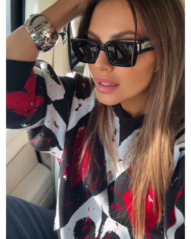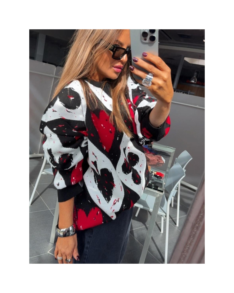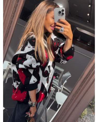 Unikatowy sweter z efektownym wzorem inspirowanym symbolami kart do gry. Tworzą wyrazisty motyw w czarno-biało-czerwonej kolorystyce. Idealny wybór dla osób ceniących oryginalny styl i odważne detale.