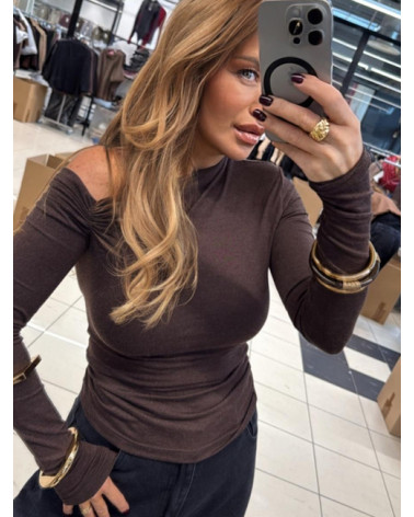 Wykonana z elastycznego, przyjemnego w dotyku materiału, doskonale dopasowuje się do ciała, eksponując jedno ramię i delikatnie odsłaniając obojczyk. Głęboki odcień czekolady to absolutny hit sezonu – pasuje zarówno do codziennych stylizacji z jeansami, jak i do bardziej eleganckich zestawów na wieczór.