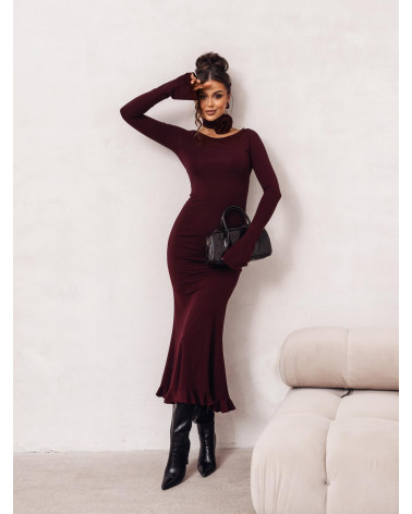 Burgundowa sukienka maxi z różą na szyi – elegancja i zmysłowość w jednym
