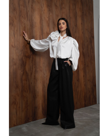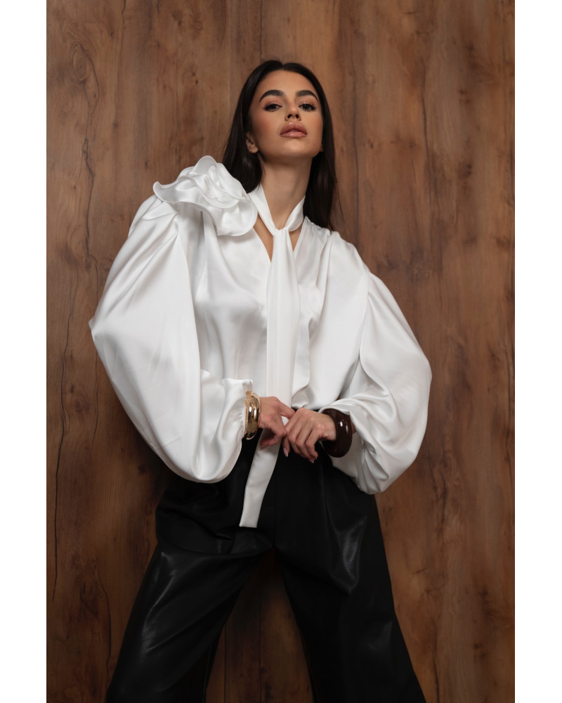 Elegancka biała koszula o luksusowym, lejącym wykończeniu. Bufiaste rękawy i subtelne marszczenia nadają jej modowego charakteru, a wiązanie przy dekolcie podkreśla kobiecą sylwetkę. Dodatkowym atutem jest odpinany kwiat, który pozwala dowolnie zmieniać charakter stylizacji. Klasyka z nowoczesnym twistem.
