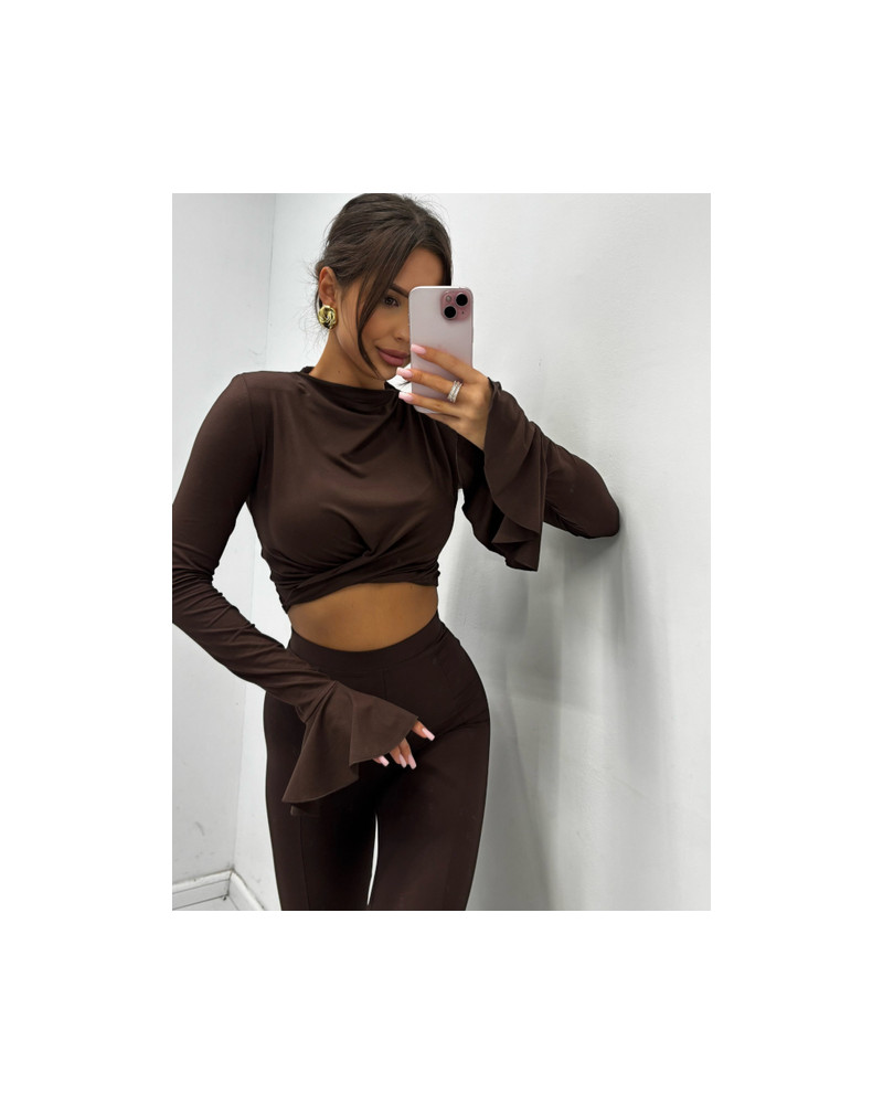 KRÓTKA BLUZKA Z RĘKAWEM DZWONEK CZEKOLADA EMO